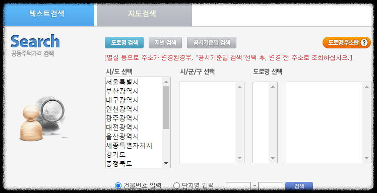 도로명 주소나 지번 정보를 알고 있다면, 텍스트 검색을 통해 공동주택가격을 빠르게 찾을 수 있습니다. 부동산 공시가격 알리미 메인화면에서 좌측상단의 "공동주택공시가격"을 클릭합니다. 그리고 "공동주택가격 열람"을 선택합니다. 입력란에 도로명 주소나 지번 정보를 입력하고 검색 버튼을 클릭하면 해당 공동주택의 가격 정보를 확인할 수 있습니다.