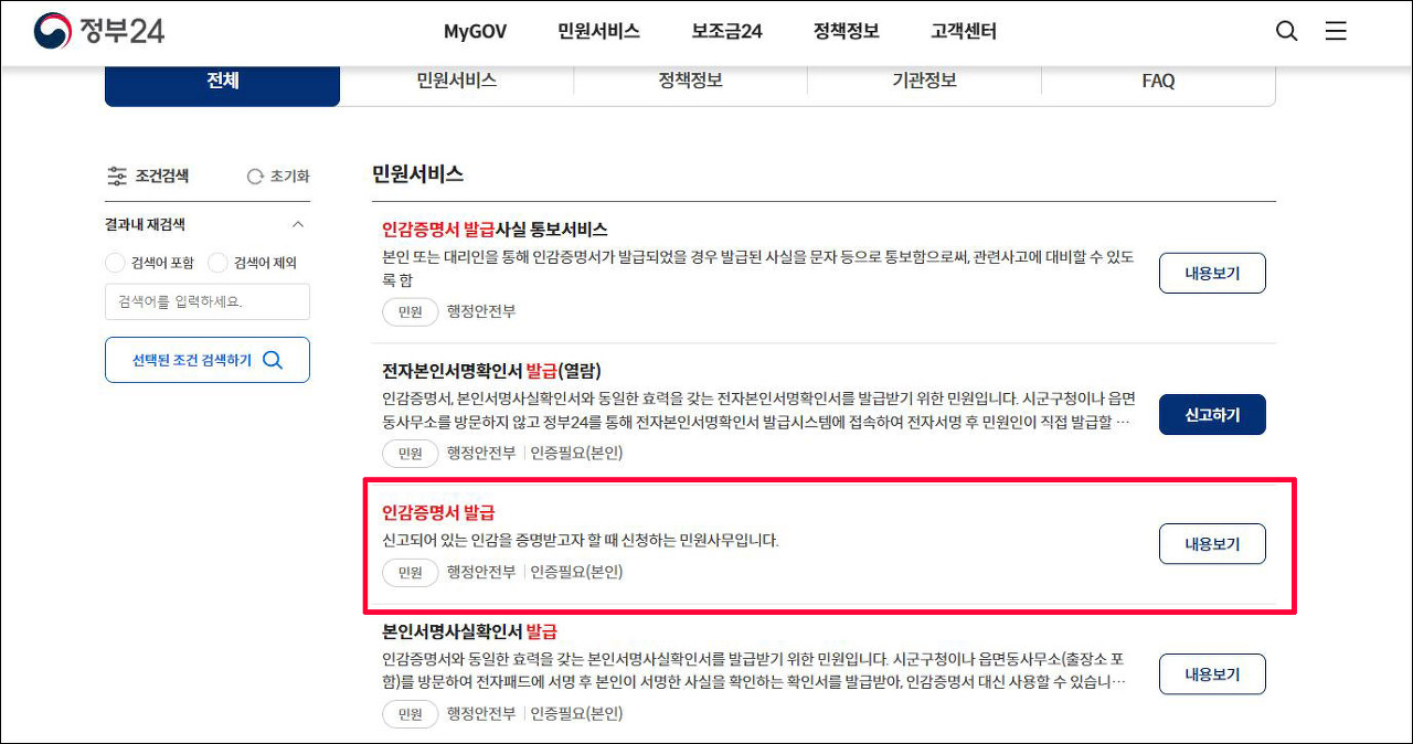 - '민원서비스' 메뉴에서 '인감증명서 발급' 선택