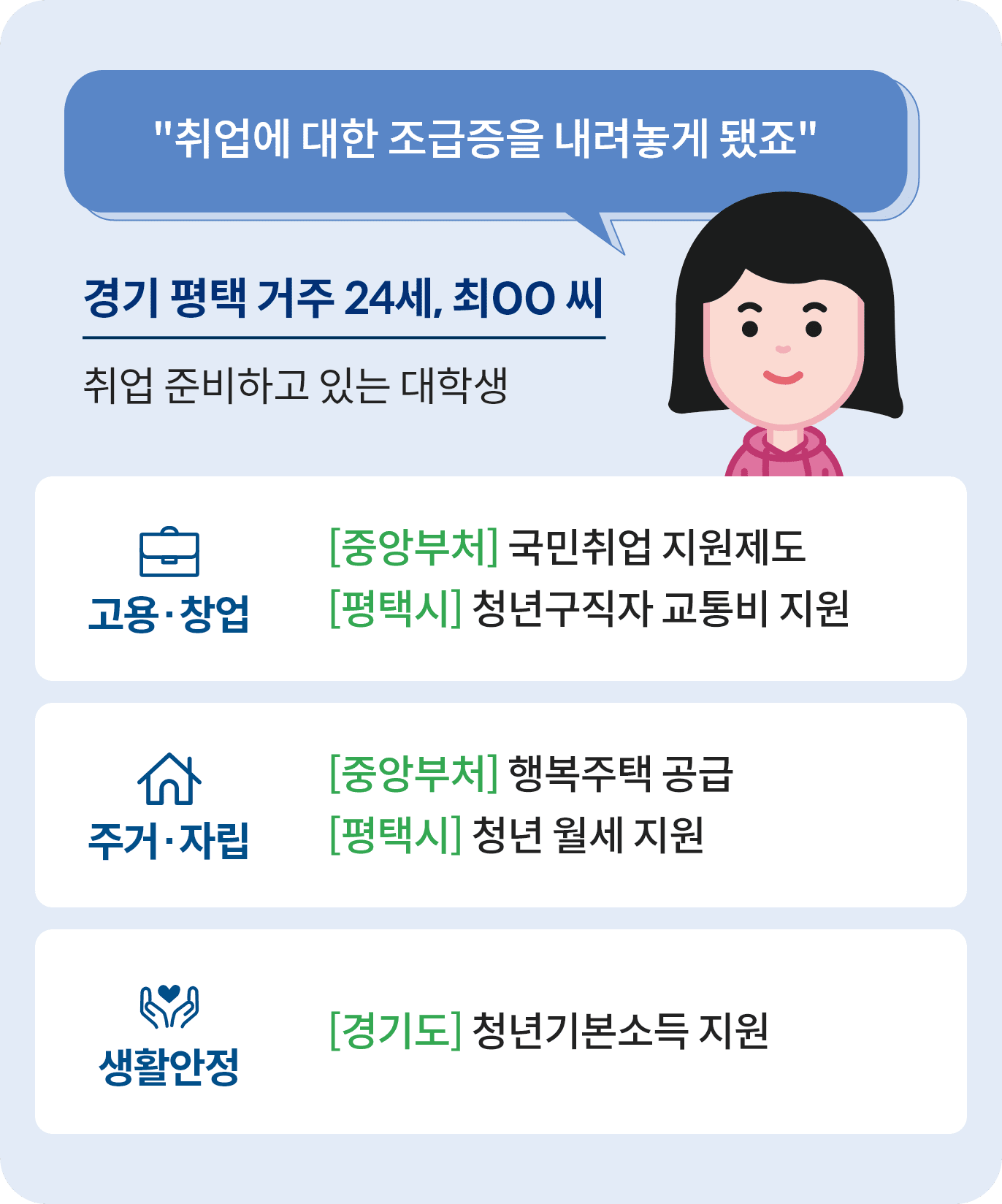 - 주거지원: 전월세 보증금, 월세 지원, 주택개량 지원