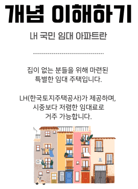 LH 국민임대아파트는 LH(한국토지주택공사)가 건설하고 관리하는 공공임대주택입니다. 이 주택은 주로 저소득층, 신혼부부, 청년, 고령자, 장애인 등 주거 취약계층을 위해 제공됩니다. LH 국민임대아파트의 가장 큰 특징은 시중 시세보다 훨씬 저렴한 임대료로 장기간 안정적인 거주가 가능하다는 점입니다.
